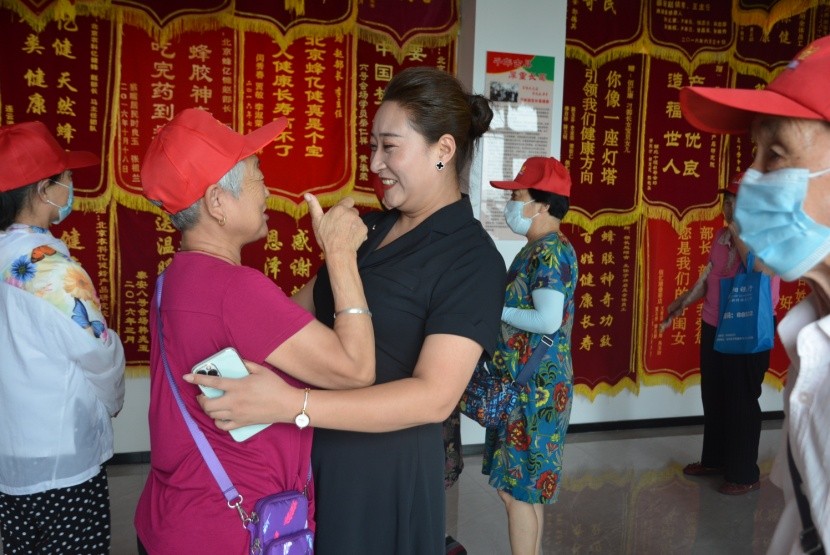 老人看到蜂亿健品牌宣传部部长李盼盼后,伸出大拇指,不住地说:“蜂亿健品牌质量好,盼盼部长服务更好!”
