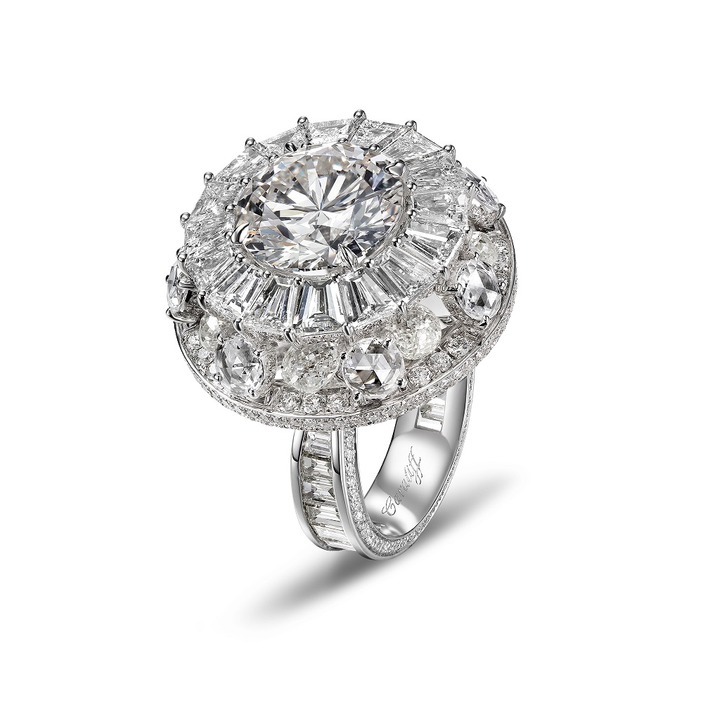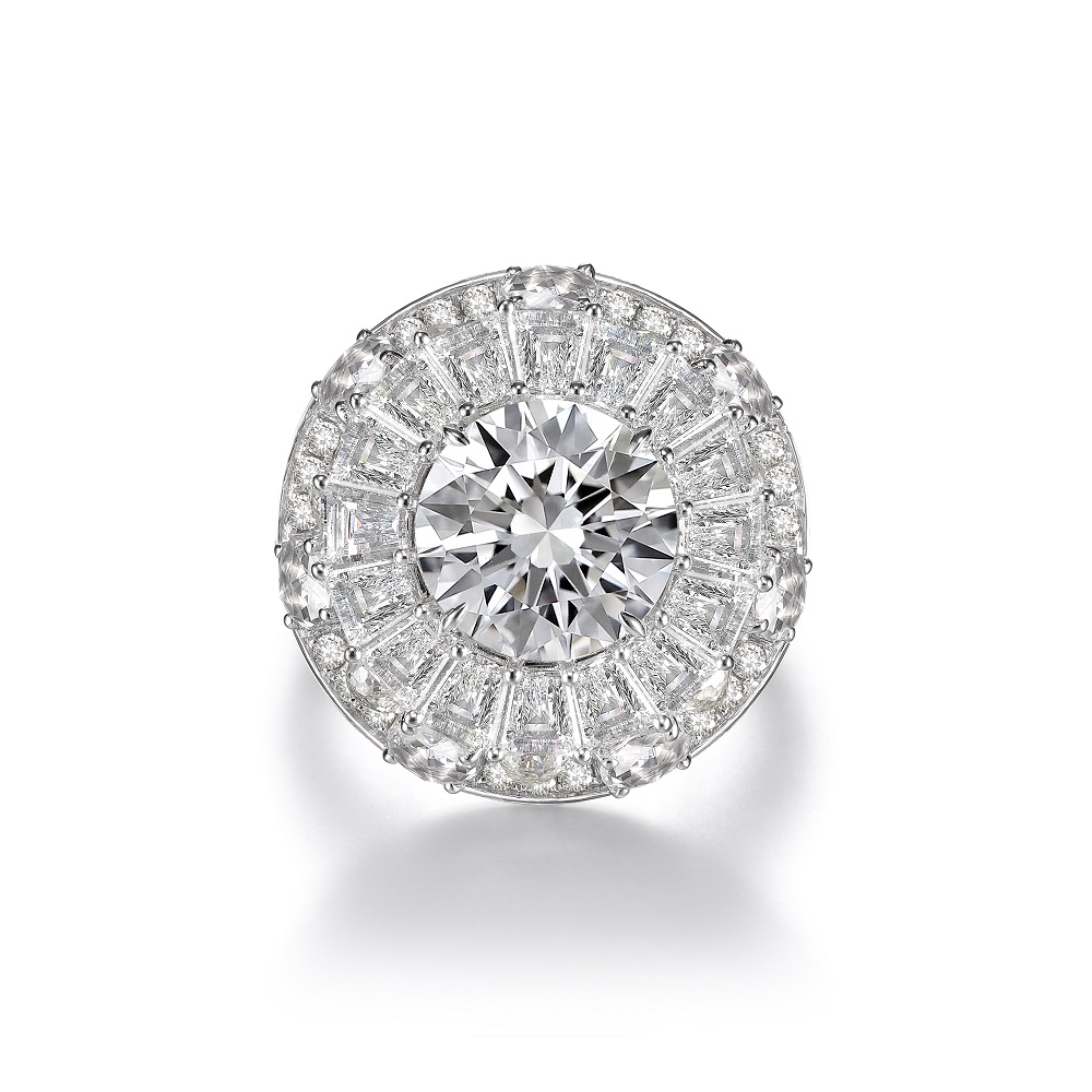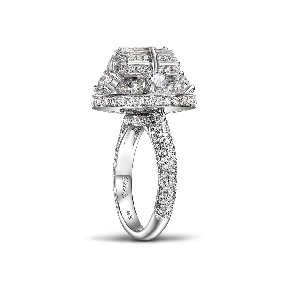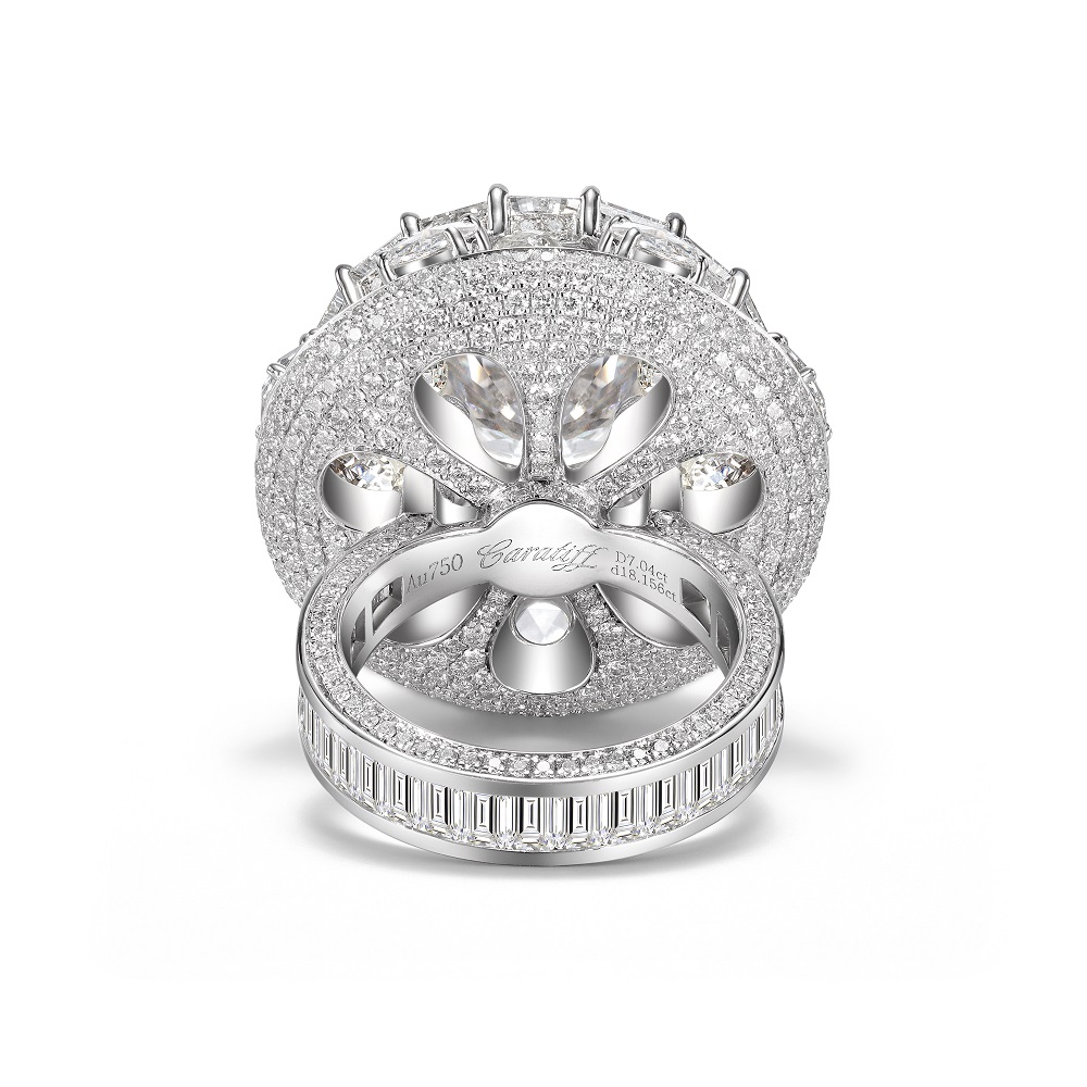Briolette系列钻戒设计为小钻石如同众星捧月一般,拥簇着中心的主钻石,先是由5.25ct梯形钻石环绕镶嵌,需要对每一颗梯型钻石单独订制切割,钻石总重18.16ct 把重达7.04ct D 色 净度VVS2 钻石呼应的熠熠生辉。