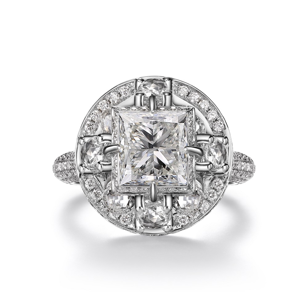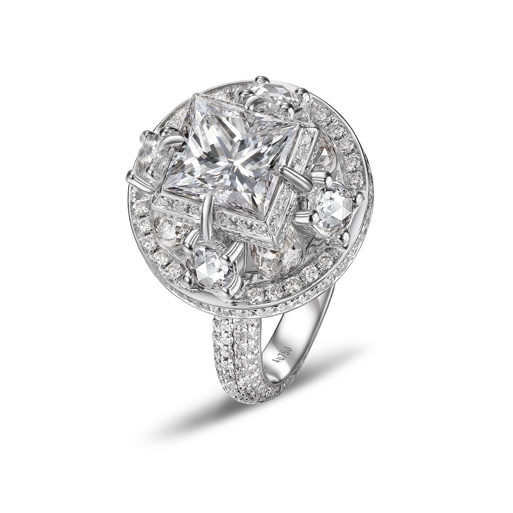 公主方钻戒以方和圆两个最基本的几何图形为设计主线,将亦刚亦柔的女性形象完美勾勒出来。这款超立体的婚戒首层选用2.75ct的主石作为点睛之笔,以方形切割的工整之美展现出智慧机敏、自信果敢的气质,主石四周的辅石则以圆形切割的柔和之美,传递出端庄典雅、内蕴丰满的气质。Briolette系列精湛之处以独特切割钻石悬空作为连接戒指顶层与底座的桥梁,嵌入其中的菠萝造型切割钻石随着指尖灵活晃动 ,给钻戒增加了趣味性与独特性。