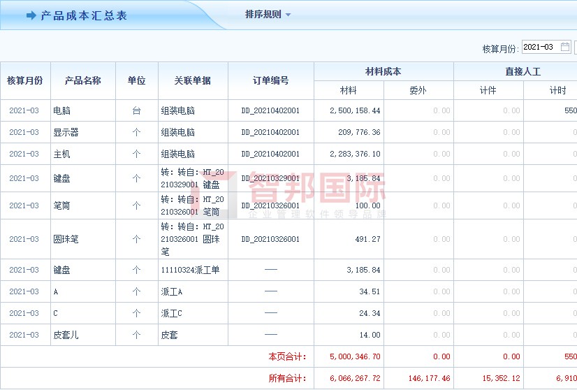智邦国际生产型企业管理软件,一键直达产品成本汇总表