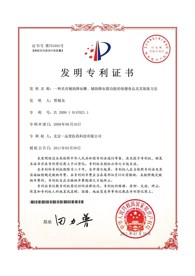 北京一品堂利用多重医用价值的纯天然植物药科学组方研制出了具有国际先进水平的糖尿病健康品——唐必可蜂胶苦瓜银杏叶软胶囊。在长达两年的临床验证及科学分析后,证明了唐必可蜂胶苦瓜银杏叶软胶囊卓越的疗效与极其可靠的安全性,唐必可蜂胶苦瓜银杏叶软胶囊在平稳血糖,降低血脂方面也有很好的作用,从而能够最大限度地减少和阻断因患者血糖、血脂过高所产生的一系列并发疾病,彻底改变了传统单一降糖药物的局限性,在综合调控上取得了重大科技突破,并于2011年3月经中华人民共和国国家知识产权局批准授予发明专利证书,证书编号:第751001号,国家认证,效果可靠,更值得信赖。