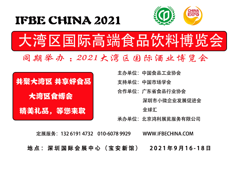 2021年9月16-18日,由中国食品工业协会主办,北京鸿利展览服务有限公司、北京中食国际会展有限公司承办的2021大湾区国际高端食品饮料博览会(以下简称“2021 IFBE China大湾区食博会”)将在深圳国际会展中心(宝安新馆)举办。本届大湾区食博会以“共聚大湾区、共享好食品”为主题,以全球化视野来诠释未来食品酒水饮料行业发展的趋势,全力打造食品酒水饮料行业的国际化贸易平台。
