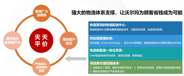 围绕着使命和核心原则,沃尔玛建立了强大的物流体系支撑,形成了财务、品牌、自然资源、管理系统、HR系统等十大内部竞争优势,还让自己始终紧贴市场前沿,市场有什么新模式、新技术,它就立即跟上,跟不上就直接收购,比如现在AI系统已经在企业发挥巨大的作用。
