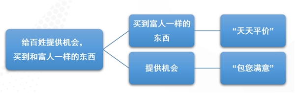 创业伊始,山姆沃尔顿先生就立下了一个信念:“我们要给百姓提供机会,使他们能买到和富人一样的东西” 。这个使命,引出沃尔玛的两个核心经营原则:天天低价,包您满意。第一家沃尔玛超市开业时,山姆沃尔顿让员工在门口挂上“天天平价”和“包您满意”的牌子。