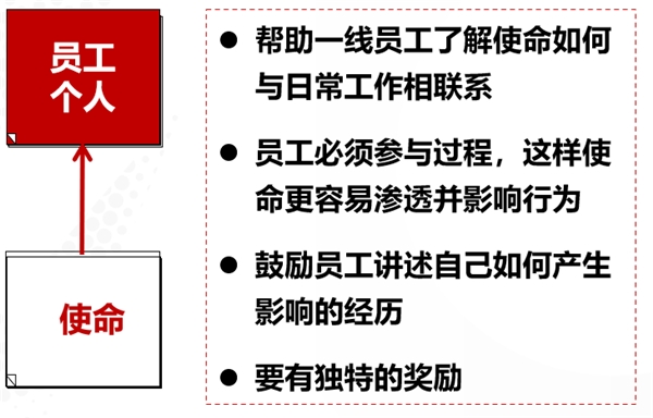 使命型组织要求每个员工都要做到使命连接,这可以帮助员工了解如何与日常工作相联系,更容易渗透并影响行为。当然,当员工做到位并取得进步和成绩时,要及时地给予表扬奖励,这会更加促进使命的深度连接和使命的影响力。