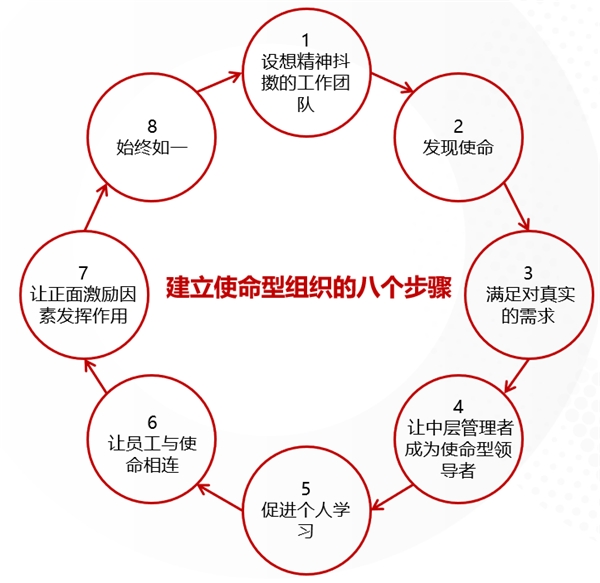 这里,我把管理大师奎因先生建立使命型组织的八个步骤,进行了一个更清晰的梳理。这八个步骤,也是可以并行的。