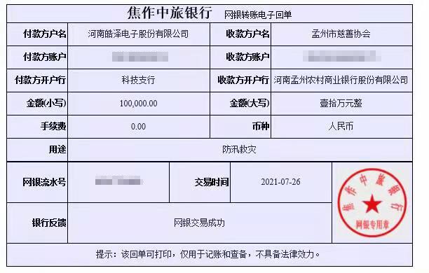 近日来,河南洪灾牵动全国人民的心,众多企业、个人、组织纷纷出钱出力,为灾区人民伸出援助之手,全国人民表现出的善良、团结、勇敢,让人一次次热泪盈眶。作为重灾区,不少河南爱心企业,不顾自身安危,在忙于自救之时,还积极向灾区捐款捐物,河南皓泽电子股份有限公司(以下简称“皓泽电子”)就是当中之一。为帮助灾后的物资补充及重建工作,7月26日,河南皓泽电子通过孟州市慈善协会向当地捐赠10万元现金。