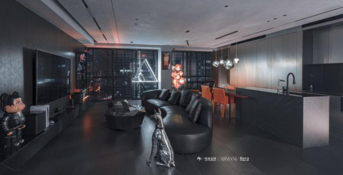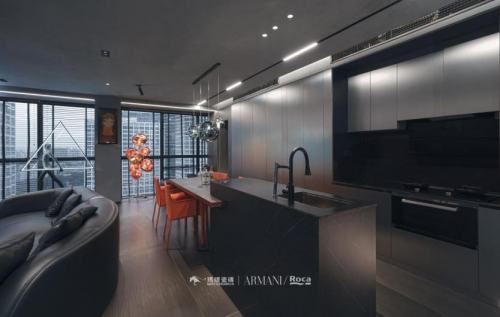餐桌与岛台一体顺延,高低有致,拥揽绝佳的视野和体验。与之呼应的柜子、墙面无缝一体,让空间更加纯净、整体。张力与温度,自由又自在。