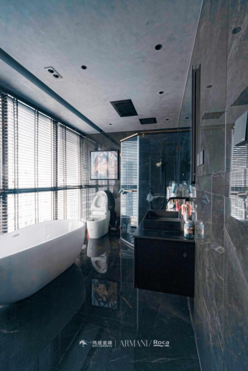 为了保持卫浴室的功能丰富而不凌乱,墙砖与地砖都挑选了普佩斯MC62C004A,当阳光透过整面落地窗洒进来、映衬着隐约的纹理,笼罩出一种时尚之感,沐浴中远眺着远处的风景,理想生活,不外如此。