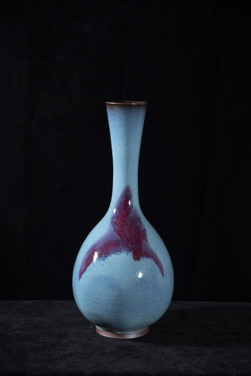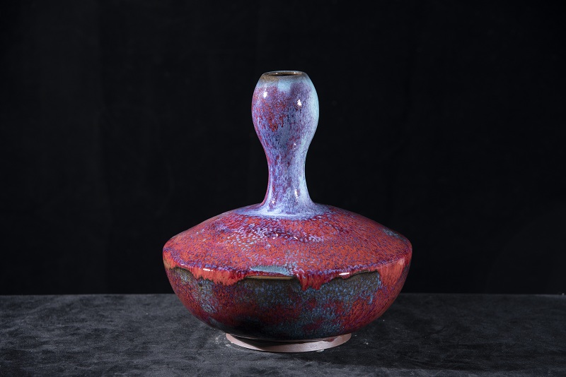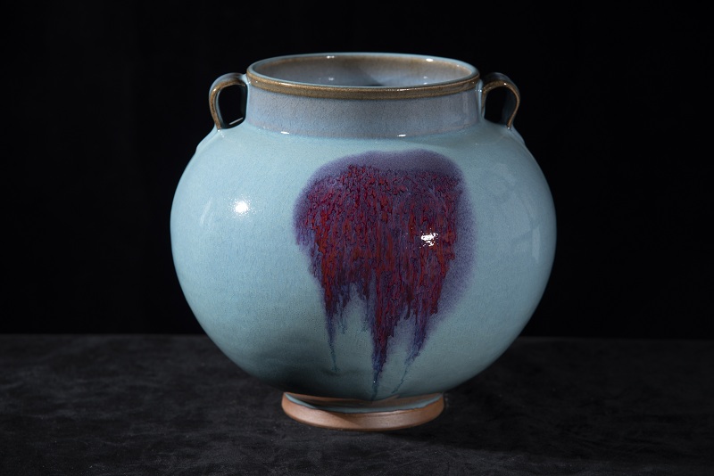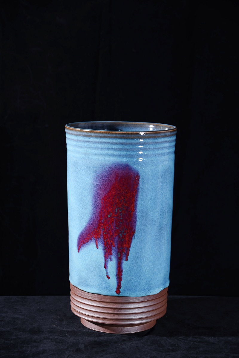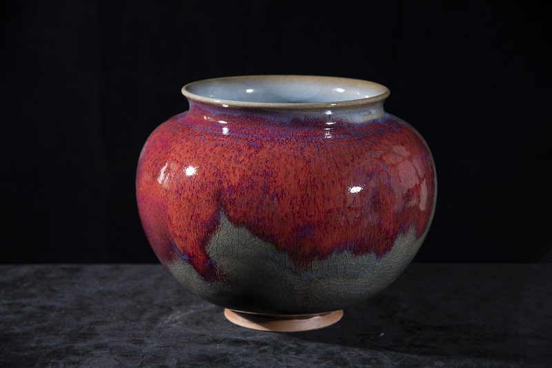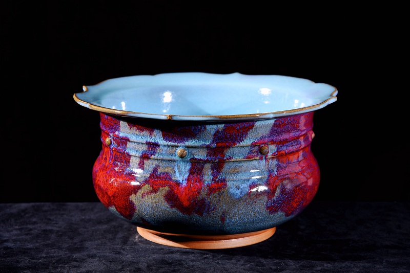 再说拉坯,杨国政喜欢拉坯,喜欢泥土在自己手上由腐朽化为神奇的那种感觉。凡是他签款的作品,大多由他亲自完成。他把揉好的泥块放在转台上,双手扶住泥块,右手拇指从顶部中心点压下,之后从底部向上缓缓提起在匀速状态下将坯体逐渐拉高,然后双手指尖内外相对,右手稍用力,在外扩中渐渐拉薄坯体。轮子在旋转,双手在舞动,十几分钟过后,一个深口大钵就出现在了杨国政那宽大厚实的手上。杨国政作品的釉色以“宋钧神韵、里蓝外红”的特色在钧瓷界享有盛誉,并深受藏家青睐。