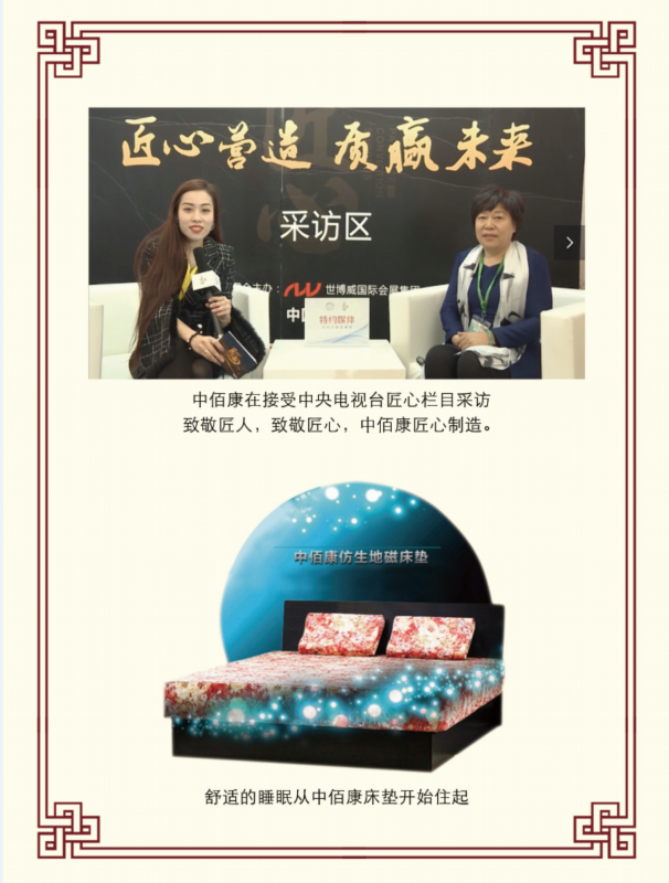 北京中佰康公司结合人体工程学、高分子材料学、物理学、传统医学等理论,运用磁、远红外、负离子的机理,先后成功研制了仿生地磁床垫、仿生地磁枕、仿生地磁坐垫、远红外负离子纳米香薰羊绒被、磁性内衣、磁性腰封等数十种高科技健康寝具产品。
