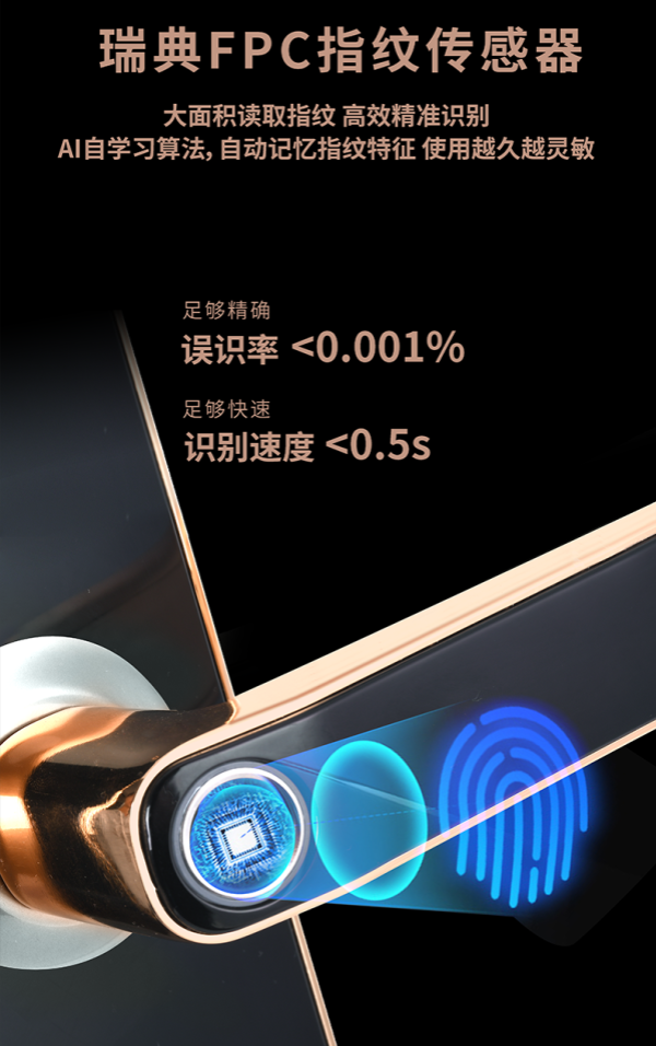 德克苏的指纹锁采用的是超B级锁芯,非常的安全,在国内率先使用屏下指纹识别,而且还在指纹识别中加入了人工智能。全自动锁体,C级锁芯,推拉式门把手。
