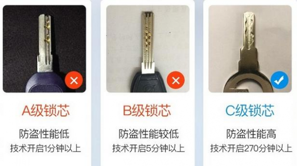 门锁的锁芯一般分为A级、B级和C级,等级越高越安全,智能门锁一般用的是C级锁芯,但会有小部分商家可能会用的是B级锁芯来代替C级锁,这点需要注意一下。