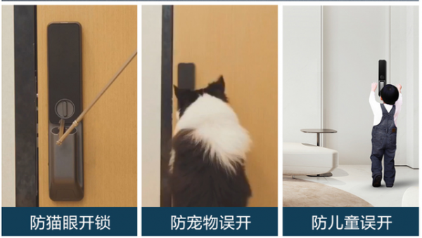 防猫眼开锁就是需要按着内侧门把手的按钮,并旋转门把手才能开门,这样安全系数更高一点,如果家里有小孩或宠物的话,尤其需要防猫眼开锁的功能。