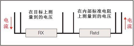 当前,国内普遍采用直流双臂电桥测量断路器等的接触电阻,其测量方法也叫四端子法。如下图所示,这种方法需要两个测量电路,分别测量目标上的电压降和仪器内标准电阻上的电压将,用两个电压之比计算出目标上的电阻值。由于测量到的电压很小,需要μV级的灵敏度,通常要求测试电流大于100A以上。这样的仪器体积笨重、抗干扰能力差。