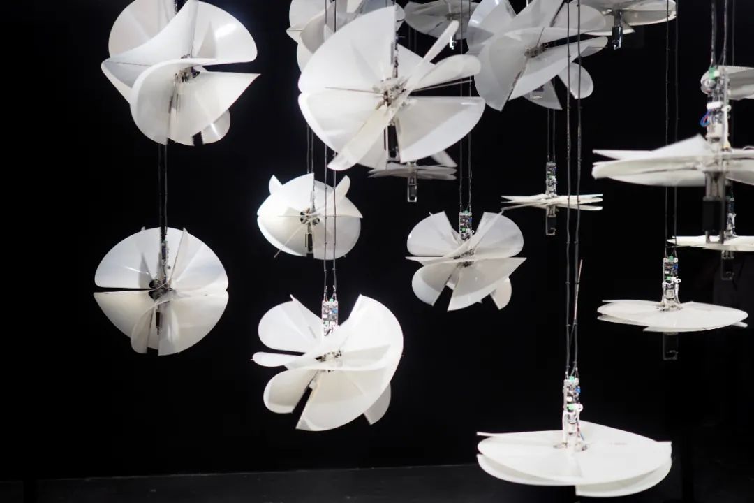 在左暘的《新物演化》中,你可以看到一个具有复合属性的无机生命体群落,机械结构通过吸收可控光源以达成”光合作用",并主动感知着人类的靠近。此外,刘奕雯与管博扬共同创造的拟态人造物亦是被赋予了生命体征,它们可以呼吸、颤动、发出鸣响。
