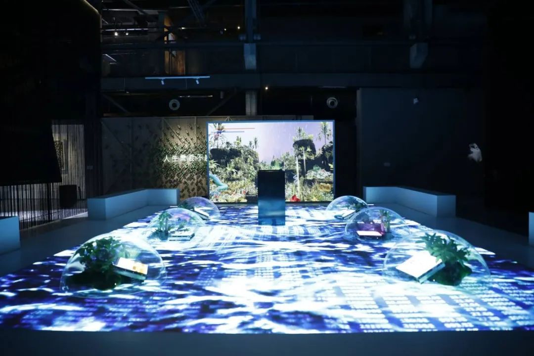 这一区域由数块屏幕错落拼接于空间之中,其中,余雪纯以数字首饰;陈抱阳以增强现实版的想象力神话;宋婷以机器学习结合观众位置坐标系而生成的花朵图像;刘嘉颖以石币的记账方式;佘璐芸以当代艺术中的阐释关键词句;李洋以不断生产的梦境精灵共同回应了NFT这一目前备受瞩目的新媒介。