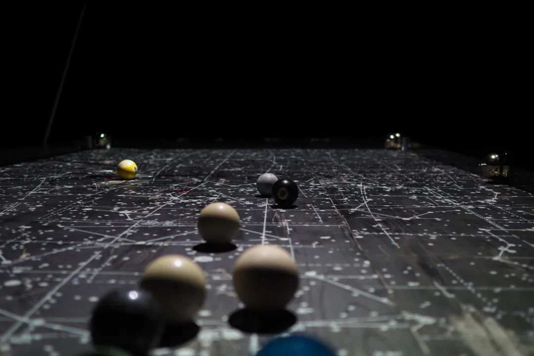 科技的社会性议题背后,是关于控制论与大数据的监视。吕艺杰将老式课桌改造为布满星系图谱的台球桌,看似轻松的游戏,却玩笑般地将观众带入了上帝视角。