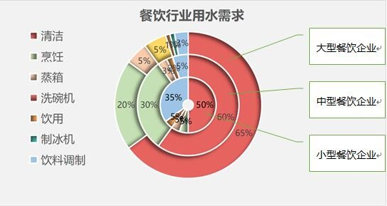 洁万佳通过对餐饮行业实际用水需求调查发现,不同规模的餐饮企业对用水的需求是不一样的。上图内环代表小型餐饮:奶茶咖啡店、小型食堂或饭店;中环代表中型餐饮:连锁餐饮业、中型食堂;外环代表大型餐饮:品牌酒店、大型食堂等。红色部分体现的是目前绝大多数餐饮企业还在用未经处理的自来水做菜品初加工以及厨房保洁用水源。随着使用年限增加,管道污染会越来越严重,食安事件几率大幅上升。目前少部分餐饮企业通过安装纯水机解决水垢、细菌等问题,废水率较高,滤芯更换频繁,多数餐饮企业使用开水器杀菌后使用,使用一段时间水垢严重,加热耗能越来越大,成本增加成为餐饮企业经营者头疼的问题。