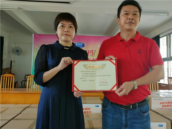 活动现场,兴宁市合水学校杨彬校长接受了两家公司的物资捐赠,并为富莱欣(中国)国际集团有限公司和广东紫芝林连锁医药药业有限公司颁发了捐赠证书,感谢两家企业的爱心奉献。