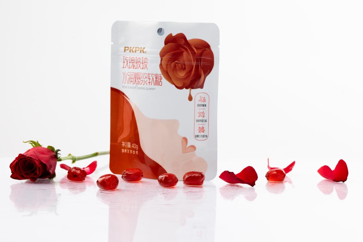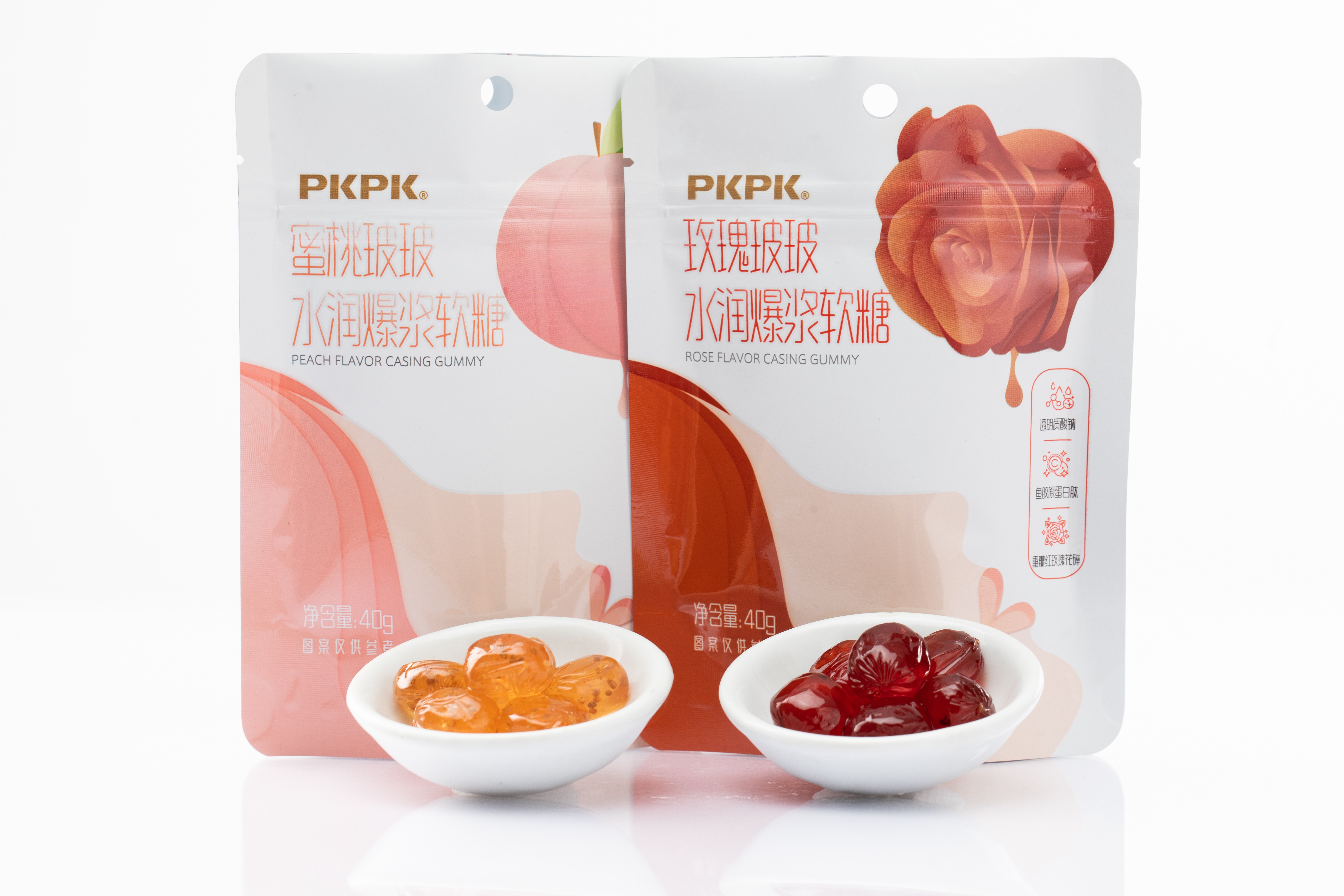 此次PKPK水润爆浆软糖推出的蜜桃玻玻、玫瑰玻玻2种口味,迎合了年轻女性当下的口感。