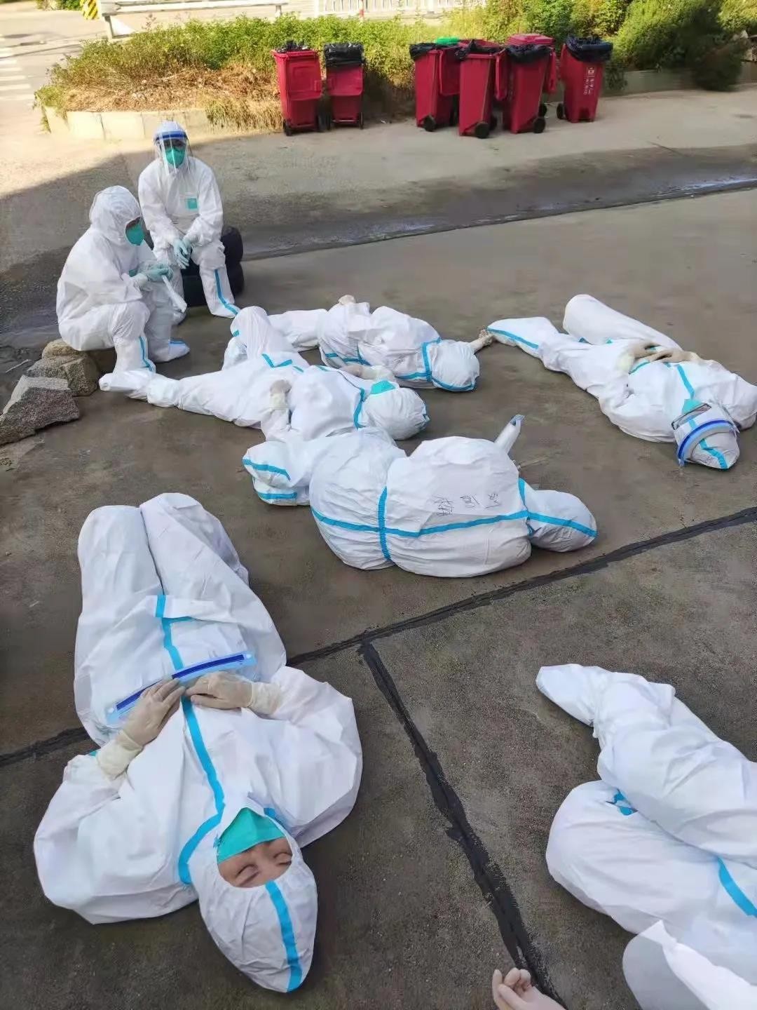 ↑出征前,医护人员为莆田学院的医学生们讲解防护服穿脱及核酸检测咽拭子采样