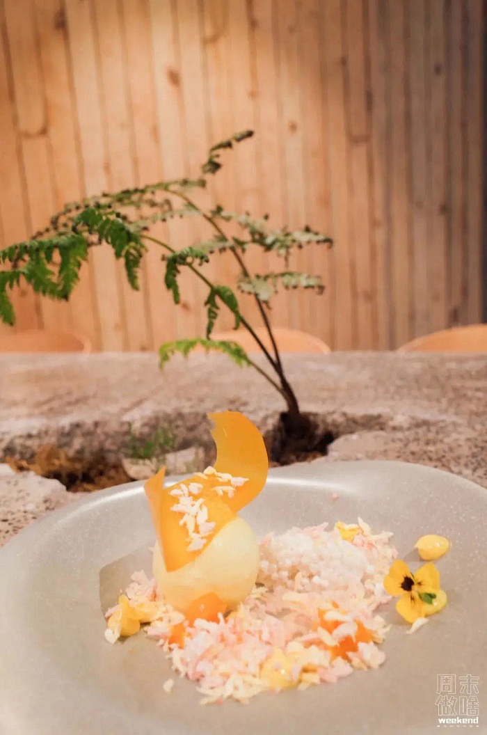 低温分子甜品“杨枝甘露”,将熟知的饮品解构成撒落盘中的芒果、西米、西柚果肉,配以干冰缭绕,仪式感满分。剖开白巧克力球,里面包裹的是柔滑的椰子奶油和百香果酱,清淡略酸的口感中和了白巧克力的甜,丰富且平衡。