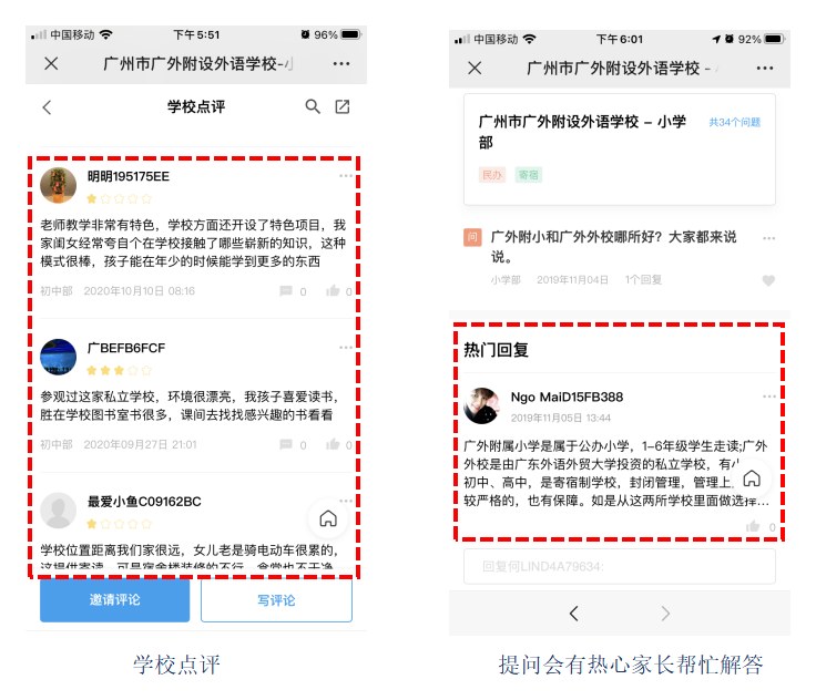 家长关心的各类学校信息,都能在“学校库”找到。无论是官方层面上的:招生方式、招生政策、招生对象、招生计划、班数、分数线、其他分校;还是其他热门的问题,例如:口碑、校风、环境如何等。平台汇集了超过321万条来源于就读过该学校的孩子家长的亲身经历及客观评价。如果想要了解更多,也可以发起提问,让更多过来人家长来帮忙解答。