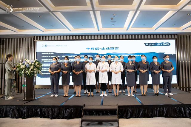 现场十月后月子中心的工作人员上台诵读“企业宣言”,而每一位进入十月后的员工都要铭记用“爱心、责任心、耐心、细心”去服务客户,做一个温暖他人的人,建立一个有温度的月子中心!