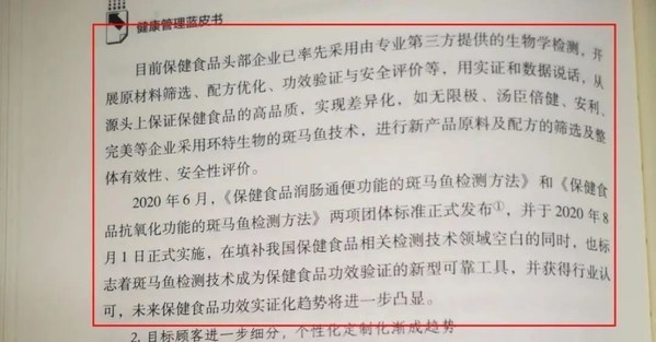 2021《中国健康管理与健康产业发展报告(健康管理蓝皮书)》中,环特生物参与编写第15章 -- 《2021年中国保健食品行业发展报告》,该篇章中,斑马鱼生物检测技术不仅成功入选中国保健食品常用的功效与安全性评价与验证方法,并作为了中国保健食品代表企业无限极在功效与安全科学论证方面的应用样本。