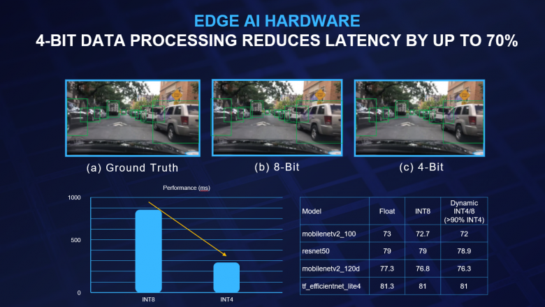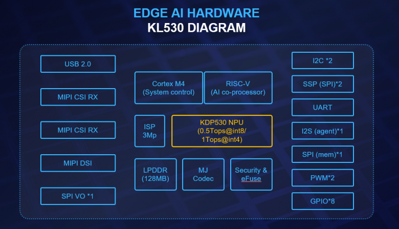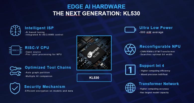 KL530 是耐能首款基于开源 RISC-V 指令集的芯片,也是目前耐能最节能的处理器。KL530 的TOPS/Watt比 KL520提升了 2 倍之多,此前,KL520的低功耗在市场上已受到广泛的认可。而在 Mobilenet 和 Resnet 等关键 AI 模型中,KL530 的性能最高可达 KL520 的 10 倍。这是一次全方位的升级。通过添加 INT4 模型的支持,把处理时间减少了 66%,而视频帧率增加了一倍,令启动时间减少了 33%,并且在同一周期内可以检测到的对象数量从 3 个增加到 8 个。