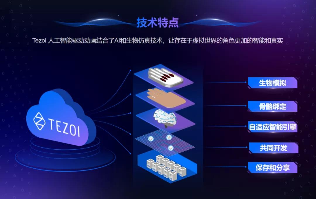 Tezoi团队通过自主研发,采用人工智能技术与生物仿真技术优化传统的虚拟内容制作,提高超写实数字人的制作效益与品质。基于现有的引擎可以快速的应用于虚拟偶像,游戏,电影,动漫等领域,未来提供虚拟内容创造平台。目前,Tezoi已经与漫威影业合作了电影《SHANG-CHI》的后期虚拟人制作,团队成员曾经与迪士尼的作品《冰雪奇缘》及《海洋奇缘》分别合作了冰与水的模拟算法,并且已与漫威影业签约将继续合作电影《Daredevil》的后期制作。