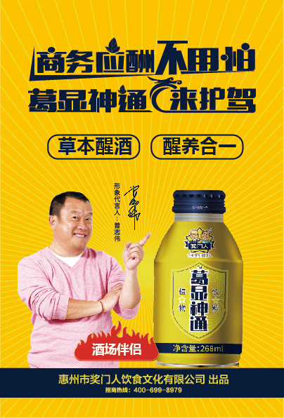近日,惠州市奖门人饮食文化有限公司推出的知名影星曾志伟代言的解酒醒酒葛显神通植物饮料新品隆重上市,引发各界媒体和消费者的广泛关注。