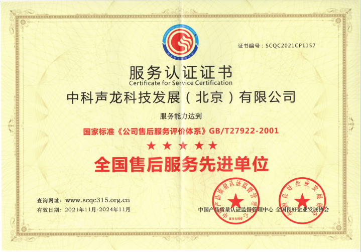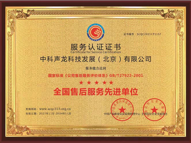 2021年11月,中科声龙科技发展(北京)有限公司获评“全国售后服务先进单位”。