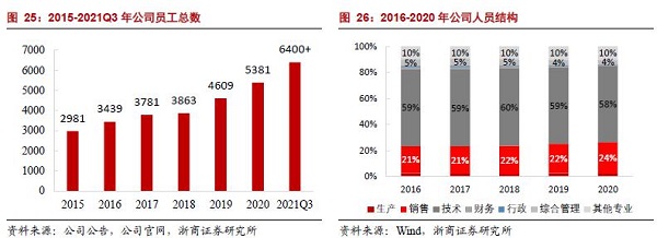 (2)2021年,公司人员规模加速扩张。截至2021年第三季度末,公司员工总数超过6400人,其中研发人员占比37%,技服人员占比25%,销售人员占比24%,整体较年初增加1000余人(其中,销售人员增加超200人),人员规模加速扩大(2018、2019、2020年总员工数分别同比增长82、746、772人)。人力资源的扩充为公司进一步提升总体业务规模提供了保障。