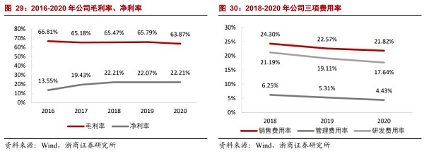 2016-2020年,(1)毛利率总体相对稳定,维持在65%左右。(2)三项费用率稳步下降,体现出公司经营效率的逐渐改善。(3)净利率上升至22%左右。