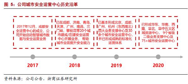 2017年12月,成都安全运营中心的成立,公司开始启动智慧城市数据与安全运营业务,旨在打造专业安全分析团队,提供覆盖全行业全技术的安全能力,解决城市信息化新技术带来的安全挑战。根据公司披露投资者交流纪要,2020年,安全运营收入6亿元。