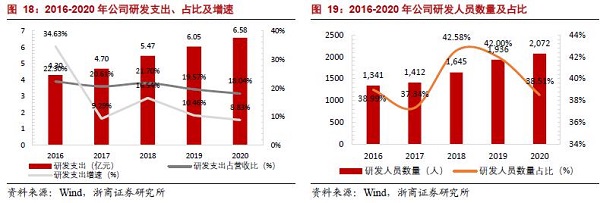(1)公司研发支出达6.58亿元,同比增长8.83%,2015-2020年CAGR为15.56%;研发支出占总营收比为18.04%,2016-2020年期间均超过18%。