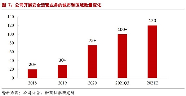 截至2021Q3,公司已形成华东、华南、西南、华北、华中五大区域资源中心,9个省级二级业务支撑中心及100+城市安全运营中心的生态体系,全国覆盖率持续扩大。
