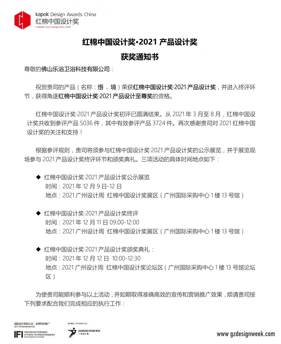 佛山乐浴卫浴有限公司(悟·境)产品从5036件参评作品中脱颖而出,荣获2021年度红棉奖产品设计奖,并获得角逐红棉奖·2021产品设计至尊奖的资格,这是佛山乐浴卫浴有限公司已经连续两年蝉联中国最具有影响力的产品设计奖之一。与此同时,乐浴卫浴成功摘下此荣誉,这不仅式对乐浴卫浴的认可,更是对其智能情调淋浴企业品牌实力的肯定。