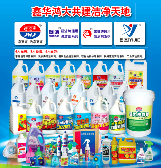 4大品牌:净万家 洁净万家 健康万家 幸福万家;三鑫牌通用清洁剂系列; 畅洁牌通用清洁剂系列; 艺杰牌通用清洁剂系列。