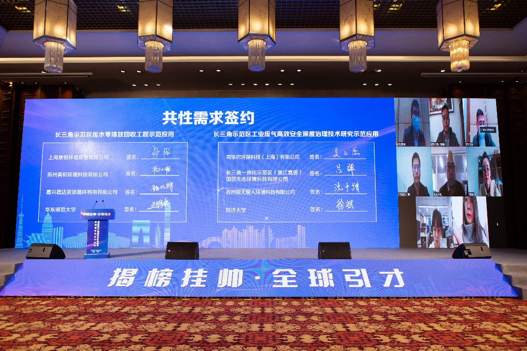 同时,三地企业还提炼出了多个共性产业技术需求,如上海康恒环境修复有限公司、苏州青和环境科技有限公司、嘉兴德达资源循环利用有限公司三家企业形成了关于废水零排放回收工程的共性示范应用需求,得到了华东师范大学专家的匹配响应,就在本次的挑战赛会场上他们通过线上方式完成了技术开发意向合同的签约;如哥乐巴环保科技(上海)有限公司、苏州敬天爱人环境科技有限公司、长三角一体化示范区(浙江嘉善)国信生态环境科技有限公司形成了关于工艺废气高效安全深度治理技术的共性示范应用需求,得到了同济大学专家的匹配响应并且完成了技术开发意向合同的签约。