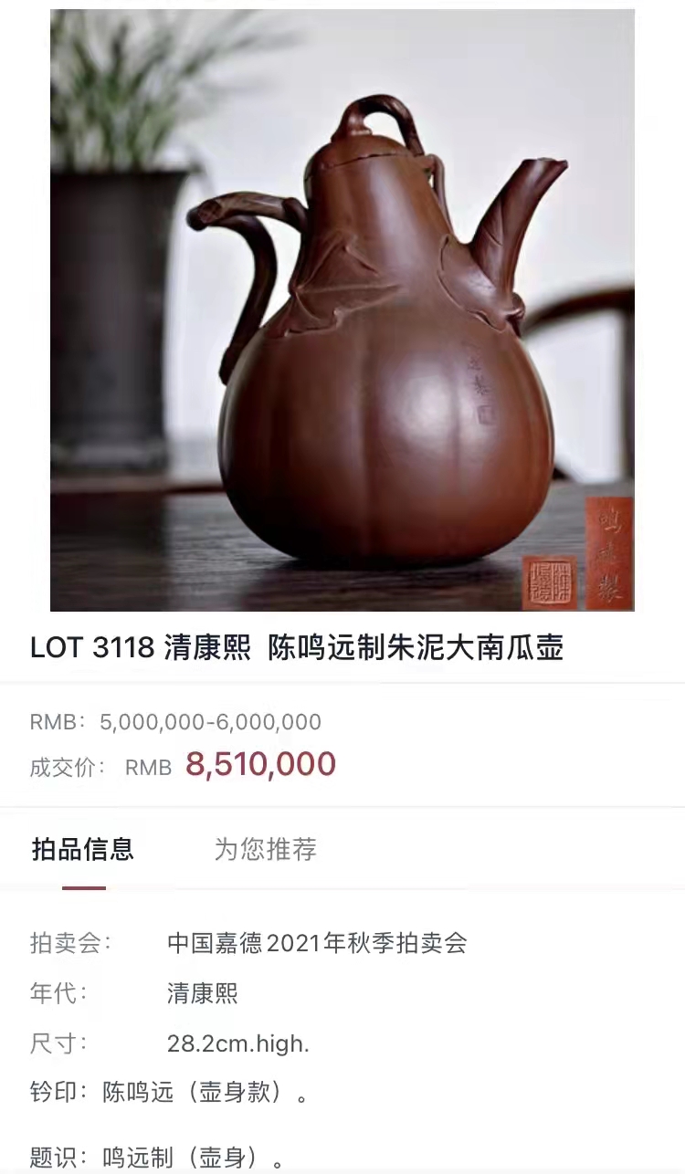 11月28日,中国嘉德2021年秋季拍卖会现场,一件修复后的清代陈鸣远制朱泥大南瓜壶拍出了全场851万的最高价,随即,引发业内一片哗然。