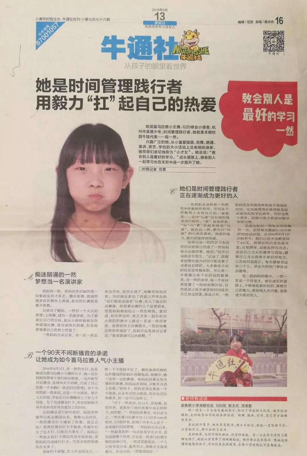 程一然小朋友表示,让她坚持演讲的动力一是热爱演讲,二是坚持,三便是自律。