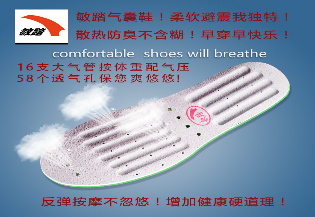 敏踏鞋业自2011年成立以来,坚持初心和树立品牌理念!是一家名符其实“研究脚感”的创新企业。在鞋类领域中拥有多项国家发明专利技术。在产品制造上始终保持匠心,精益求精;十年磨一剑!今年在原来技术重新开发系列“双层气垫鞋”;这种气囊鞋的核心技术是在鞋垫中安装20支可以按体重标配气压的气管,让使用者享受恰到好处的气压反弹“微按摩”效果;柔软避震很独特!散热防臭不含糊!是一双货真价实的保健鞋。因此,本次与央视合作更加切实印证了敏踏的决心做到立足于中国,取信于世界的品牌理念,在中国质造的道路上不断创新挑战未来!
