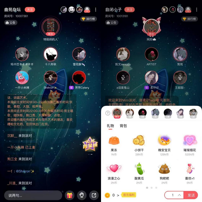 目前,有几个派对房间的气氛都非常活跃,给主播礼物一晚的打赏也十分可观。