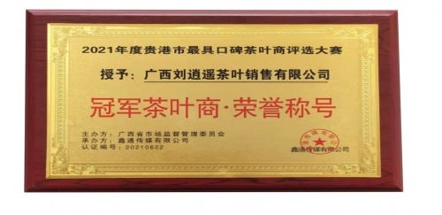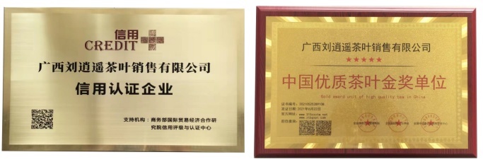 广西刘逍遥茶叶销售有限公司经过时间的沉淀我们企业也荣获:商务部信用评级与认证中心颁发的信用认证企业;荣获:中国优质茶叶金奖单位;荣获:冠军茶叶商荣誉称号等荣誉。