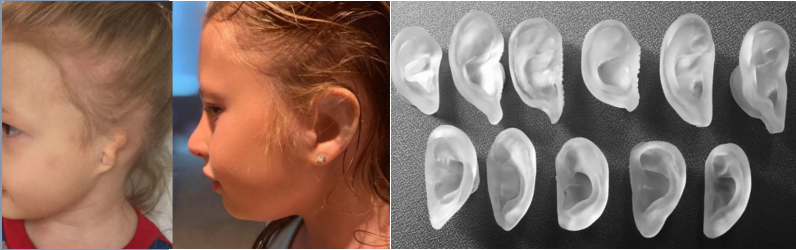 小耳症患者,通过三维扫描仪采集患者的正常耳数据,然后通过3D设计软件对称的耳部模型,打印修复材料,从而得到舒适且美观对称的修复耳,减少手术次数,大幅降低患者的痛苦。