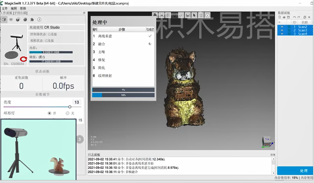 3、无需贴点,“傻瓜式”操作,具有高保真、高还原优势。采集三维数据时,常规操作需要在被扫描物体上贴标志点,操作繁杂、耗时过长,还容易损伤物体表面。而Magic Swift扫描全程无需任何贴点,搭配积木易搭自主研发、拥有强大算法的3D编模软件Ruler3D,自动承接扫描数据,实时进行纹理映射、纹理修复、3D结果可视化,具有色彩还原度高、高保真优势。几乎人人可操作,5分钟即可完成扫描建模,大幅度拉低了三维建模的准入门槛。