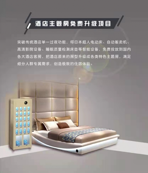 激眠主题房升级项目,不动装修,只需将超人电动床、高清影院设备以及自动贩卖机等一系列智能配件嵌入房间,就能让普通的大床房、双床房秒变情侣房、亲子房、影院房。高效便捷的同时,酒店还不需要花一分钱。